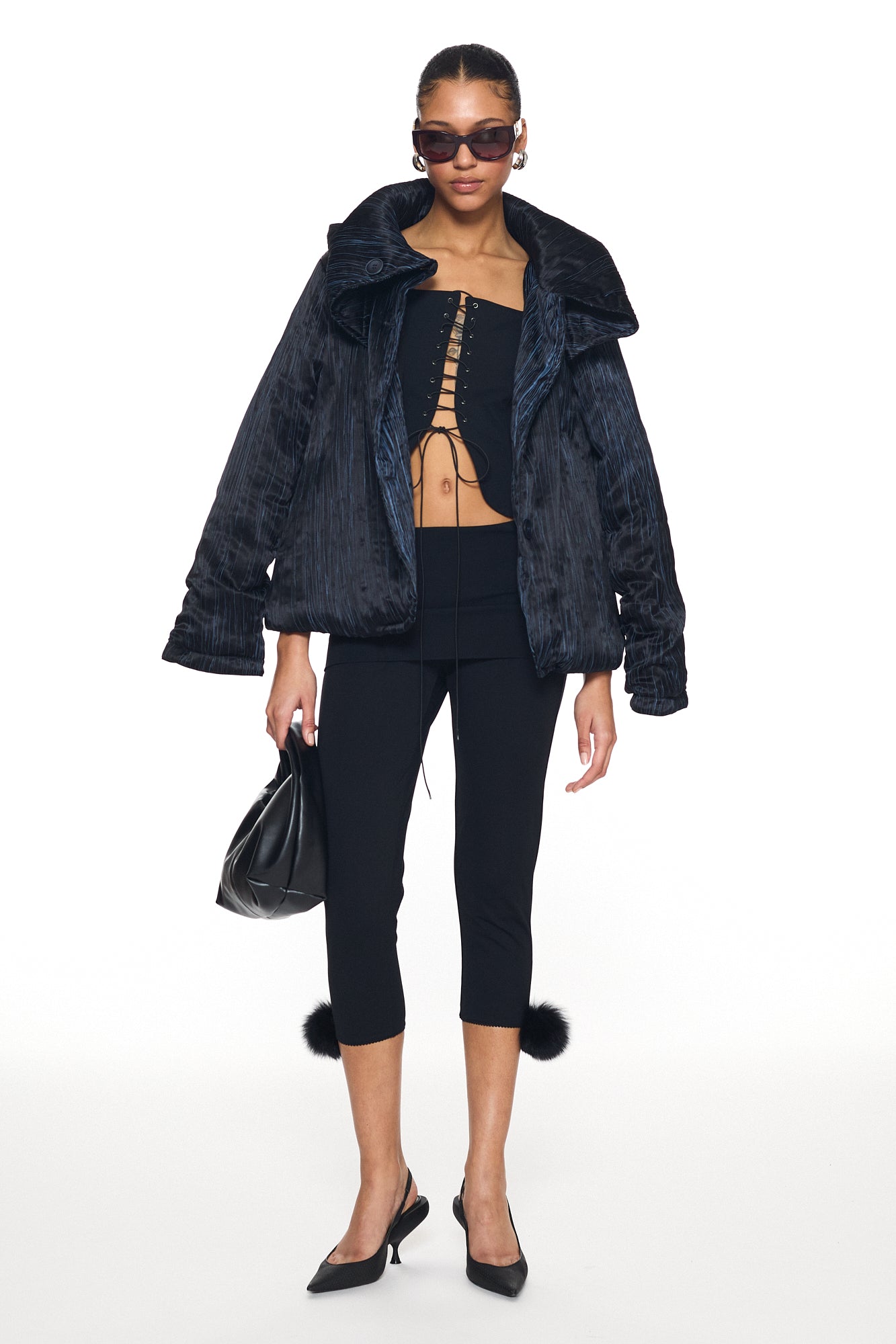 Stretch jersey leggings cut to a close fit, detailed with playful pom-poms along the lower side seams. Designed to move with the body, they bring rhythm and a soft sense of motion to everyday minimalism.