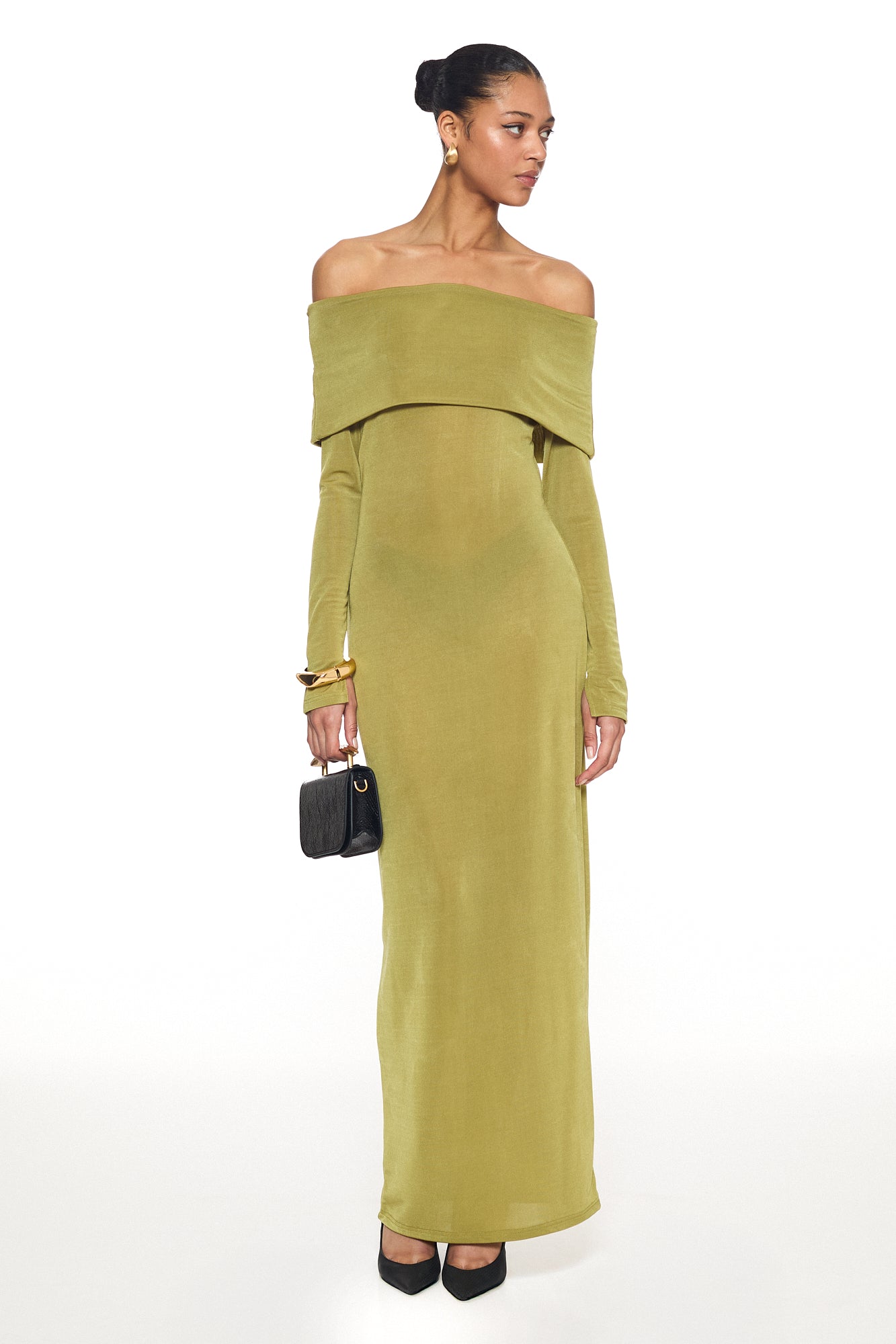 Architectural drama in a striking chartreuse hue, this gown is defined by its wide, folded bardot neckline. Crafted from semi-sheer material, its elongated form and long sleeves offer a look of effortless modernism.