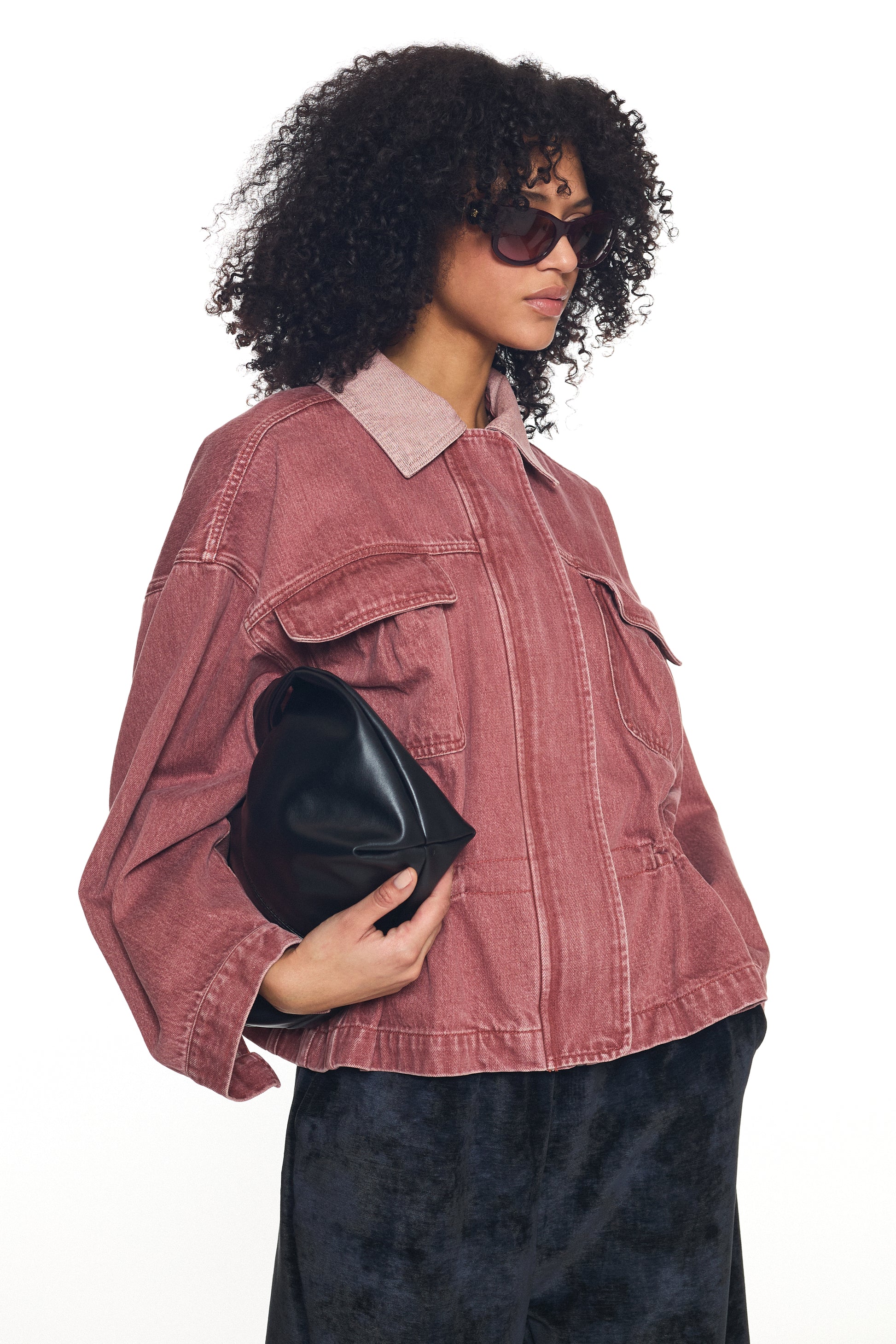 A relaxed oversize jacket cut from washed red denim, featuring front pockets, a soft collar, and an adjustable drawstring waist that shapes the silhouette.