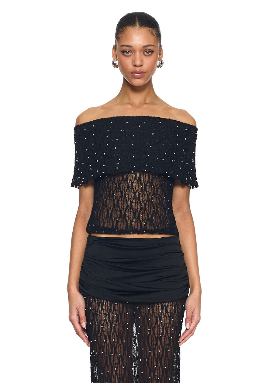 A black off-shoulder top crafted from stretch lace and delicately adorned with white pearls.